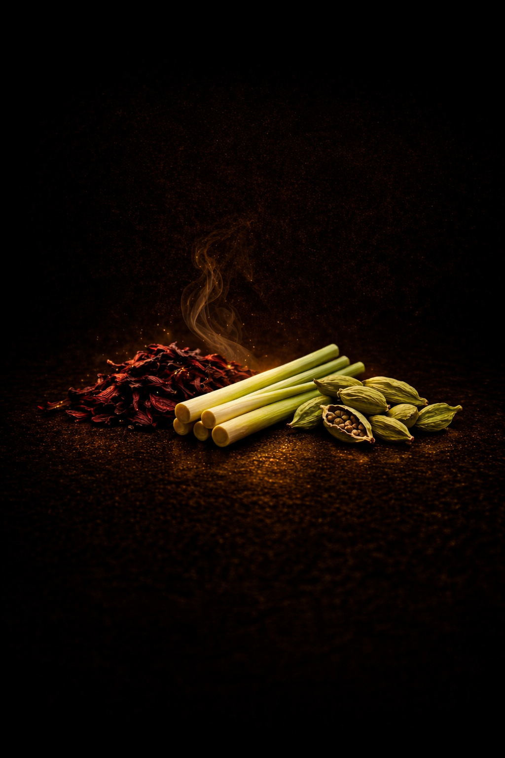 A vivid meeting of sun-dried hibiscus and fresh lemongrass — tart, citrusy, and deeply invigorating. Pure botanicals in perfect harmony.